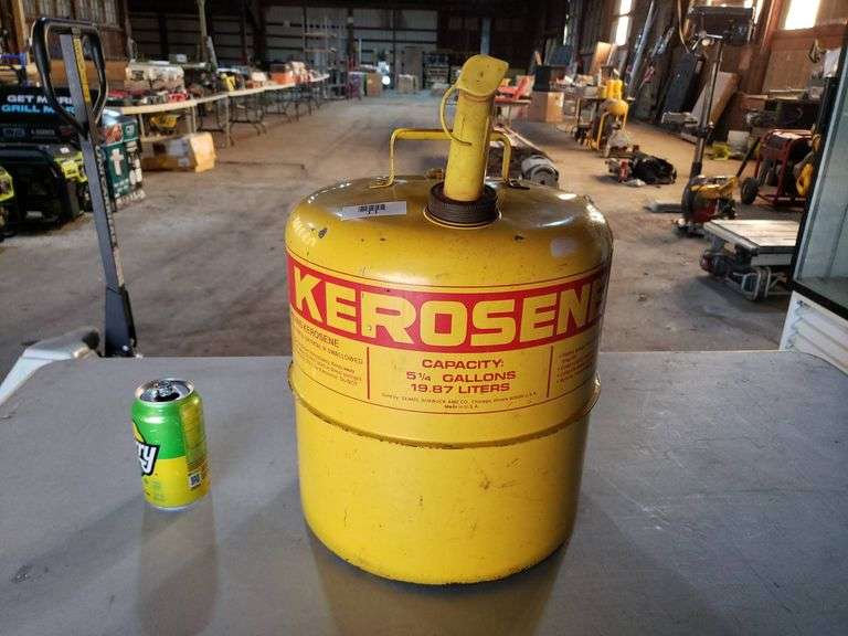 Sears Craftsman yellow kerosene safety can featuring capacity markings for 5 gallons. Includes a spout and built-in handle for transportation. Clearly labeled for kerosene storage and safety.