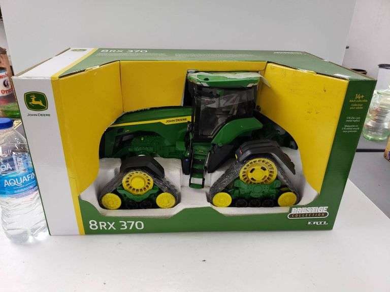 John Deere 8RX 370 model from the Prestige Collection by ERTL, featuring detailed tracks and cab design. Packaged in its original branded box with manufacturer information on the back.