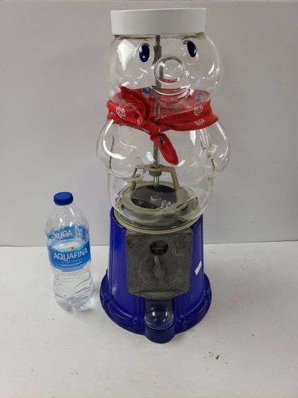 Bear-shaped candy or gumball dispenser featuring a clear body, blue base, and a red bandana. The base is metal and has a dispensing slot. The top lid is removable for refilling.