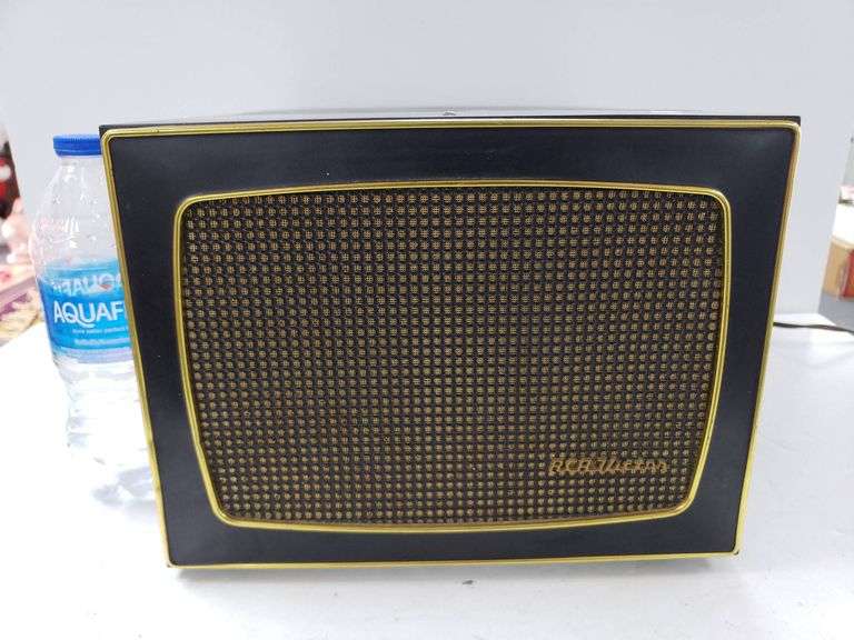 RCA Victor Model 45HY-4 record player featuring a built-in speaker and dual control knobs. Includes a 45 RPM record-capable turntable and interior mechanisms visible under the base plate. Model details are displayed on the manufacturer’s label.