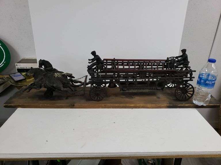Cast iron fire wagon featuring horse-drawn design, two figures, and a detailed ladder on an extended cart. Includes intricate chain elements and mounted on a wooden board.