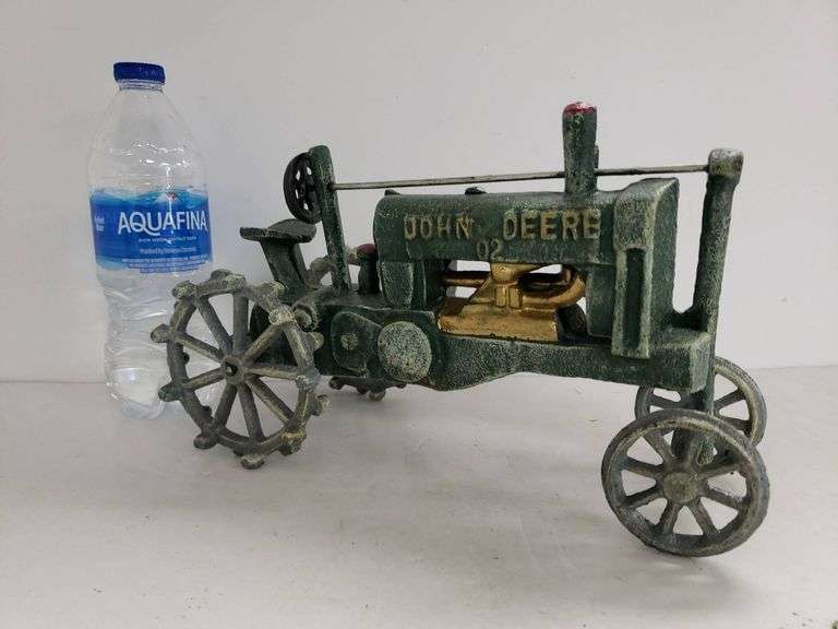 Cast iron John Deere Model 02 tractor figurine featuring functional spoked wheels and a green finish with gold accents. Includes intricate detailing throughout. Approximately the size of a water bottle.
