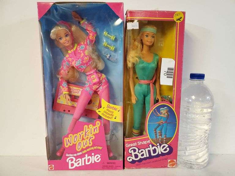2 Mattel Barbie dolls, including Workin' Out Barbie in colorful activewear and Great Shape Barbie in a teal exercise outfit. Both items are in original packaging, featuring accessories and design details.