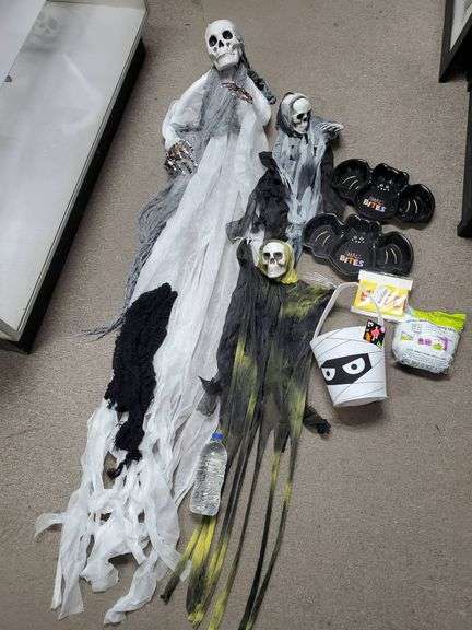 Halloween decorations including hanging skeleton figures, three black bat-shaped trays labeled 'Small Bites,' a mummy-themed bucket, cotton web decoration, and candy corn snacks.