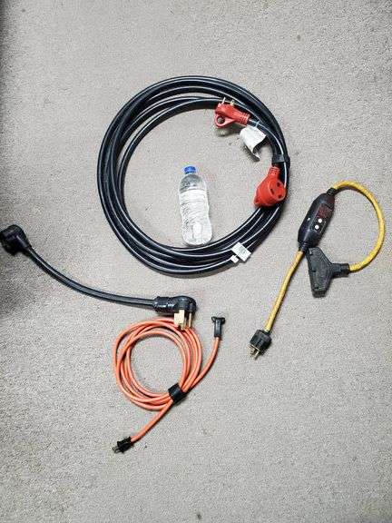 Electrical items including power cables, extension cords, and adapters suitable for various uses. Includes red and black cables, orange cable, yellow adapter, and more.