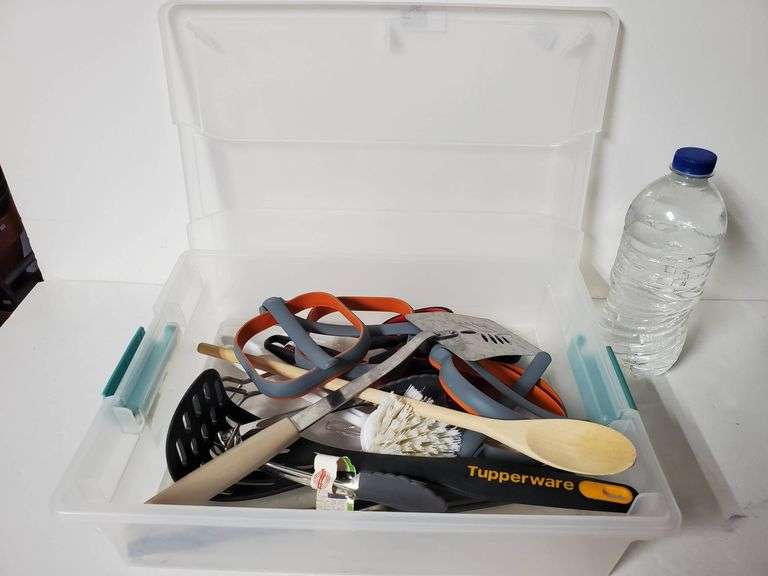 Plastic storage bin containing a variety of kitchen tools, including a brush, slotted turner, wooden spoon, and several silicone bands. Includes a Tupperware branded item.
