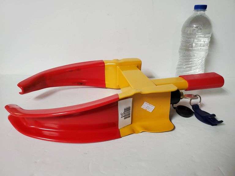Yellow and red vehicle wheel lock, designed to clamp wheels securely. Comes with a blue key and lock mechanism. Provides security to protect against unauthorized vehicle movement.