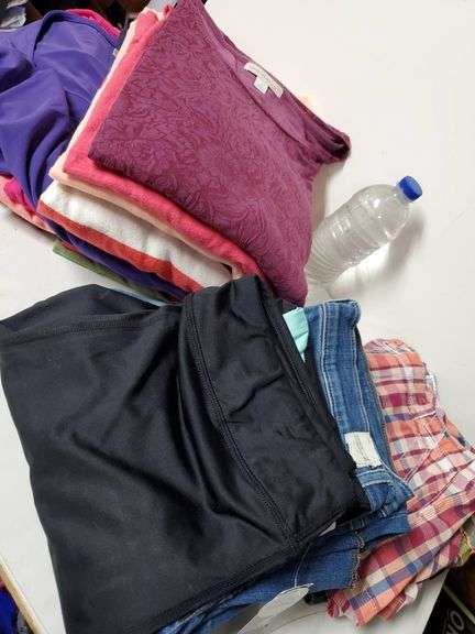 Ladies clothing in sizes M/L/XL includes tops in various colors, patterned shorts, denim, and active leggings. Tags visible on some items. A mix of sizes 8-18 based on provided tag details.