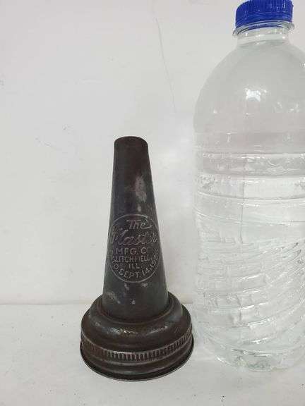The Master Mfg. Co. oil fill spout made in Litchfield, Illinois. Features a conical design with embossed lettering on the surface. Functional spout with base designed for attachment.