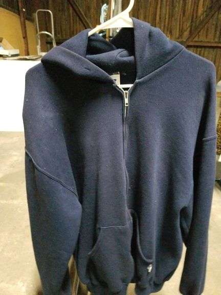 Russell Athletic navy blue zip-up hoodie featuring two front pockets, a hood, and a zipper closure. Labeled as size L and made in Mexico.