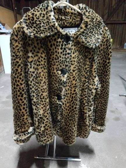 Leopard print coat by Boulevard East with a collared design and button front closure. Made in the USA and tagged 'Boulevard East.' Features a bold animal print pattern throughout.
