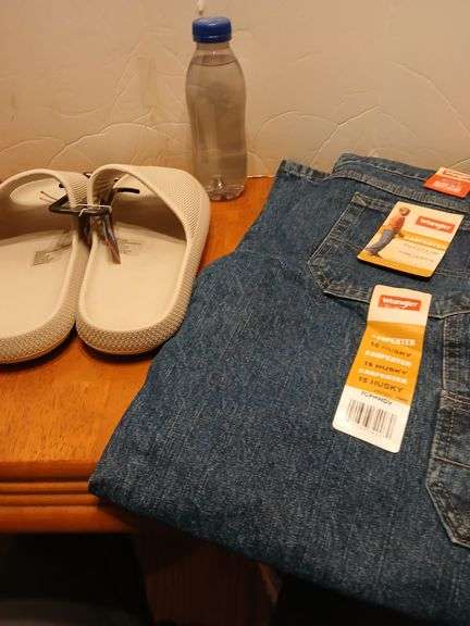 LOT 44 - NEW Pair of Size Men's S8/9 Slide ons NEW Pair of Wrangler 16 Husky Carpenter Jeans