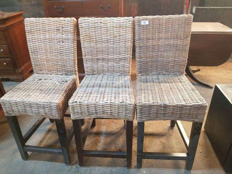 3 high-back chairs featuring woven seats and backs, supported by dark-colored frames. The design showcases sturdy construction and an earthy aesthetic, suitable for various interiors.