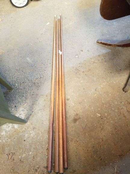 Multiple pool cues, each marked with 'Brizzy's Billiards' and additional numbering. Cues feature tips and end caps, suitable for cue sports.