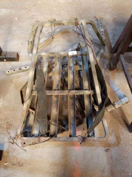 Metal sled frame with integrated straps and attached hardware. Includes multiple holes along the frame for attaching additional parts or accessories. Ideal for transport or other uses.