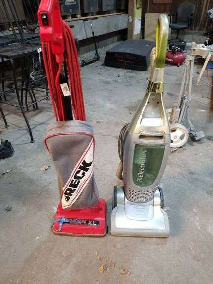 Includes an Oreck Commercial XL vacuum cleaner with a red and gray design and an Electrolux Versatility vacuum cleaner with a green and silver design. Both are upright models featuring cords and accessory attachments.