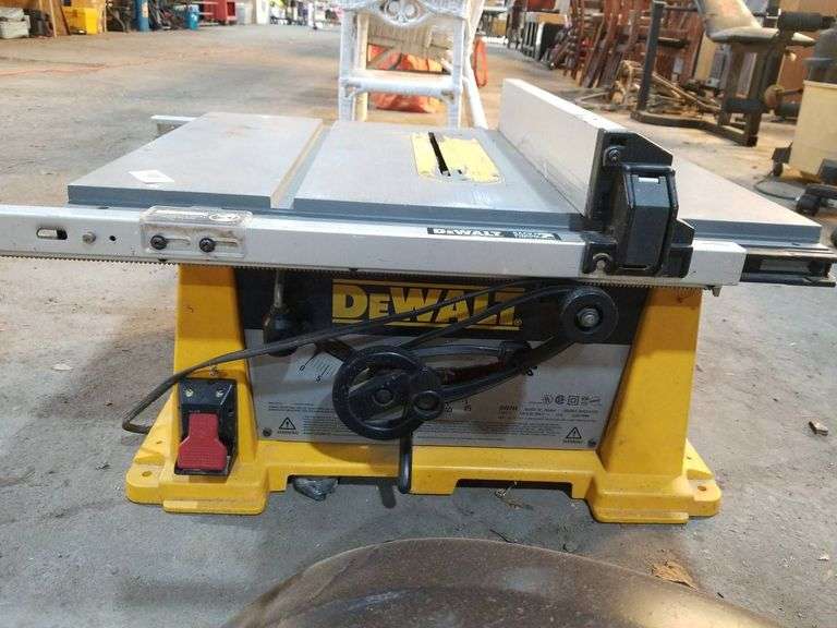 DeWalt table saw featuring a sturdy base and an adjustable fence. Equipped with a blade guard system and control panel for operation. Compact and portable design suitable for project use.