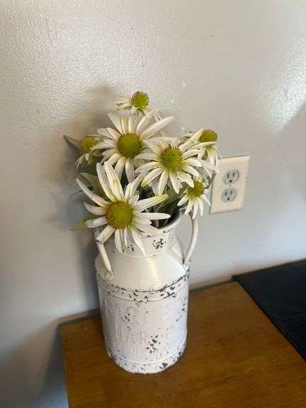 LOT 35 - Galvanized Milk Can With Faux White Daisies