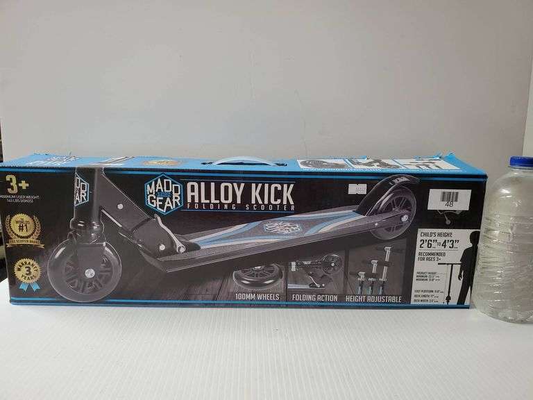 Mad Gear Alloy Kick Folding Scooter featuring height adjustable handlebars, soft foam grips, and 100mm wheels. Designed for children with a height range of 2'6'' to 4'3'' and recommended for ages 3+.