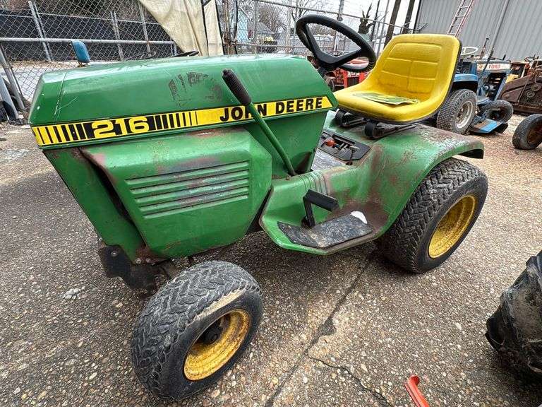 John Deere 216 lawn tractor manufactured in the USA, featuring a Kohler K341AQS single-cylinder engine. The tractor is equipped with a yellow seat, rear tail lights, and standard foot and hand controls.