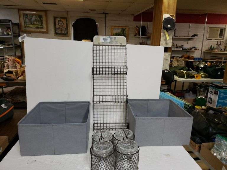 LOT 614 - Grey Cloth Storage Containers, Post Office Letter Holder, Decorative Metal Jar Holder