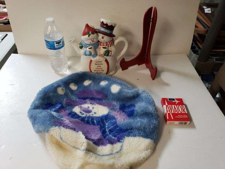 LOT 19 - Snowman Toilet Cover, Teapot, Plate Stand And Playing Cards