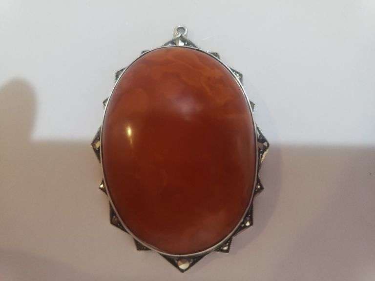 LOT 766 - Ladies Pendant W/Large Red-orange Stone- Marked Germany Sterling